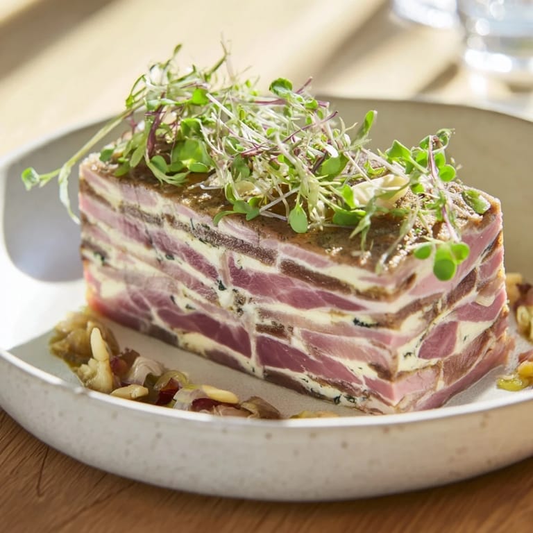 Present this terrine with fresh toasted brioche or a sturdy crusty bread to echo the layers and give guests something to accompany each slice. A light red wine like a Pinot Noir or a crisp white like Sauvignon Blanc cuts through the richness without overpowering the delicate meat flavors. Follow it with a sharp salad and good conversation—this dish demands an audience.