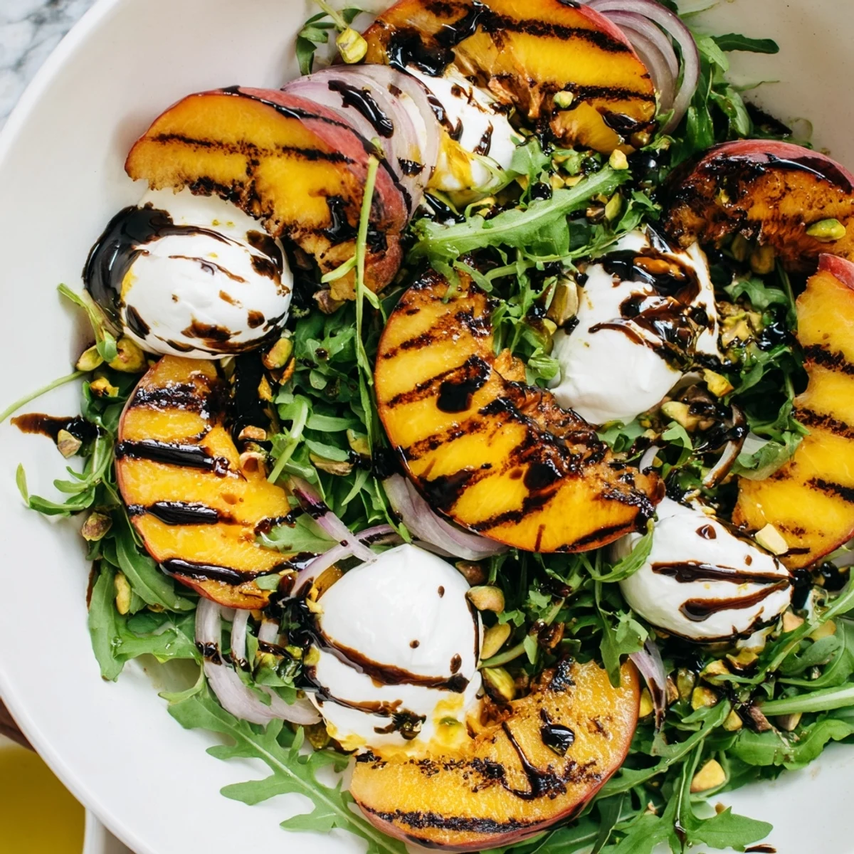 The secret to salads that actually feel like meals is understanding that texture is just as important as taste. The soft arugula and creamy burrata give you base notes, the grilled peaches add sweetness and a slightly charred chew, and the nuts come in at the end like the cymbal crash that makes everything land. The balsamic glaze is thick enough to cling to everything instead of pooling at the bottom of the bowl, so every bite feels intentional.