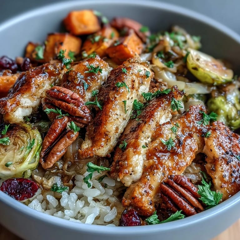 - Divide your cooked rice among four bowls, creating a warm base, then layer on the roasted sweet potatoes and Brussels sprouts. Top with your sliced chicken, drizzle with any remaining glaze, and finish with a scatter of toasted pecans, dried cranberries, and fresh parsley.
