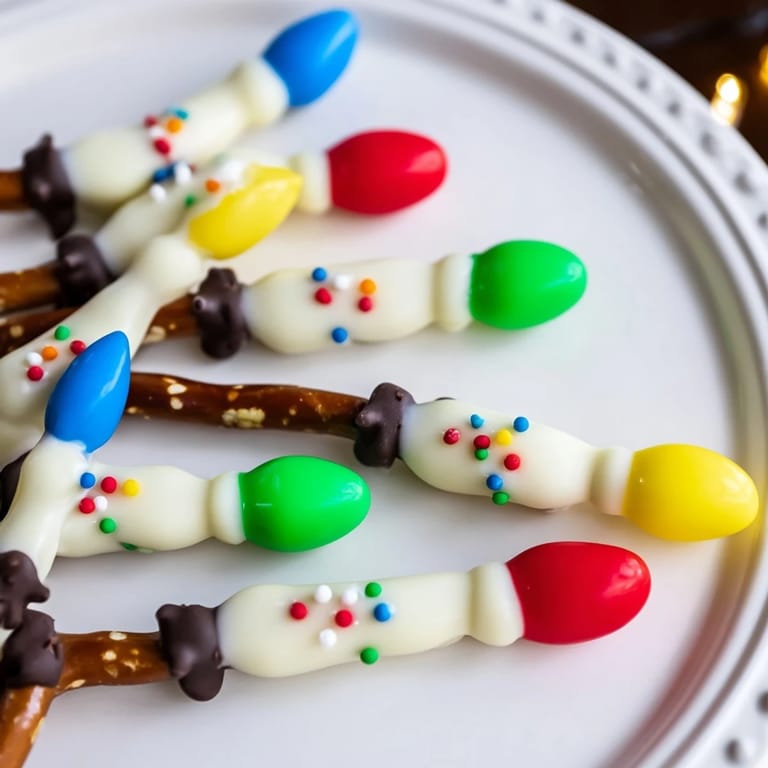 Save A festive, fun, and easy holiday treat featuring pretzel sticks dipped in colorful candy melts and decorated like Christmas lights. Perfect for kids and parties no oven required!