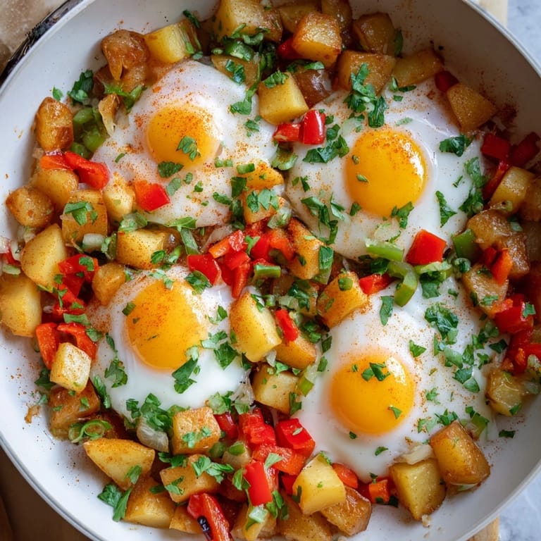 Save A comforting, rustic one-pan meal featuring golden potatoes, sautéed vegetables, and perfectly cooked eggs—ideal for a quick weeknight dinner or hearty breakfast.